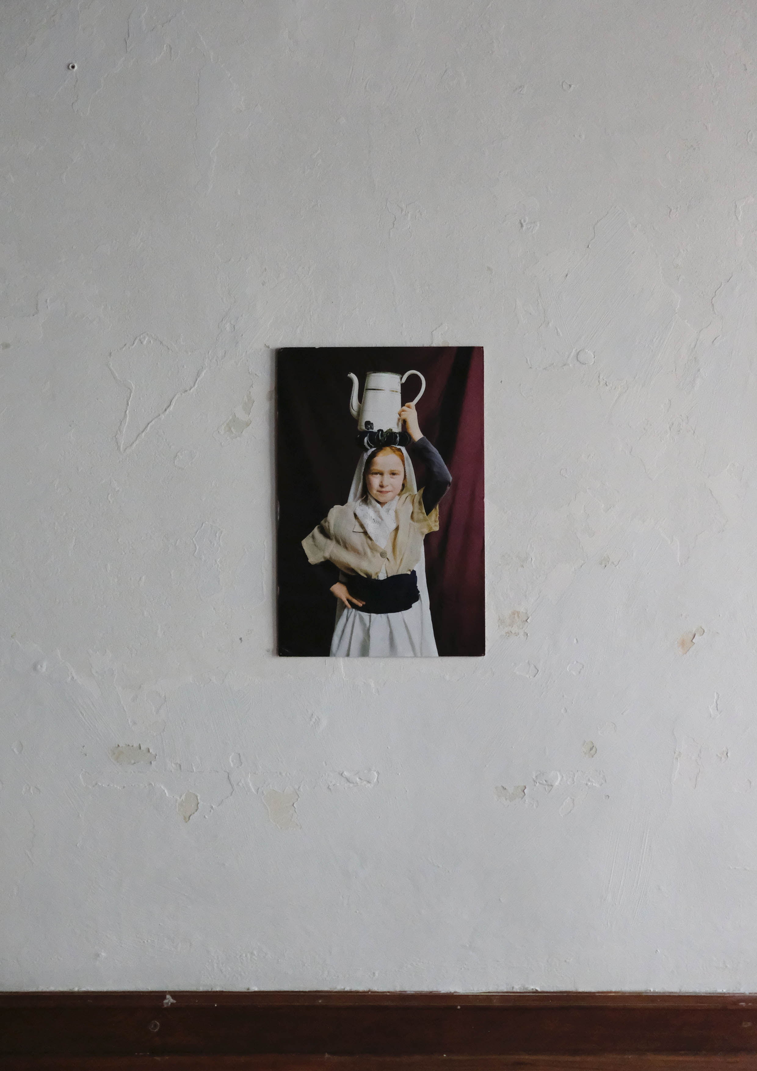 Dans le cadre du projet, ce geste artistique réactivé devient un outil de transmission. Les enfants, photographiés en studio ou sur la place du village, rejouent les postures et les gestes de leurs aïeux. Les mises en scène s’inspirent de cartes postales anciennes conservées dans les collections du Musée de la Carte postale de Baud et du Musée de Bretagne à Rennes. Chaque enfant porte un système de portage d’eau conçu et fabriqué durant la semaine d’intervention.